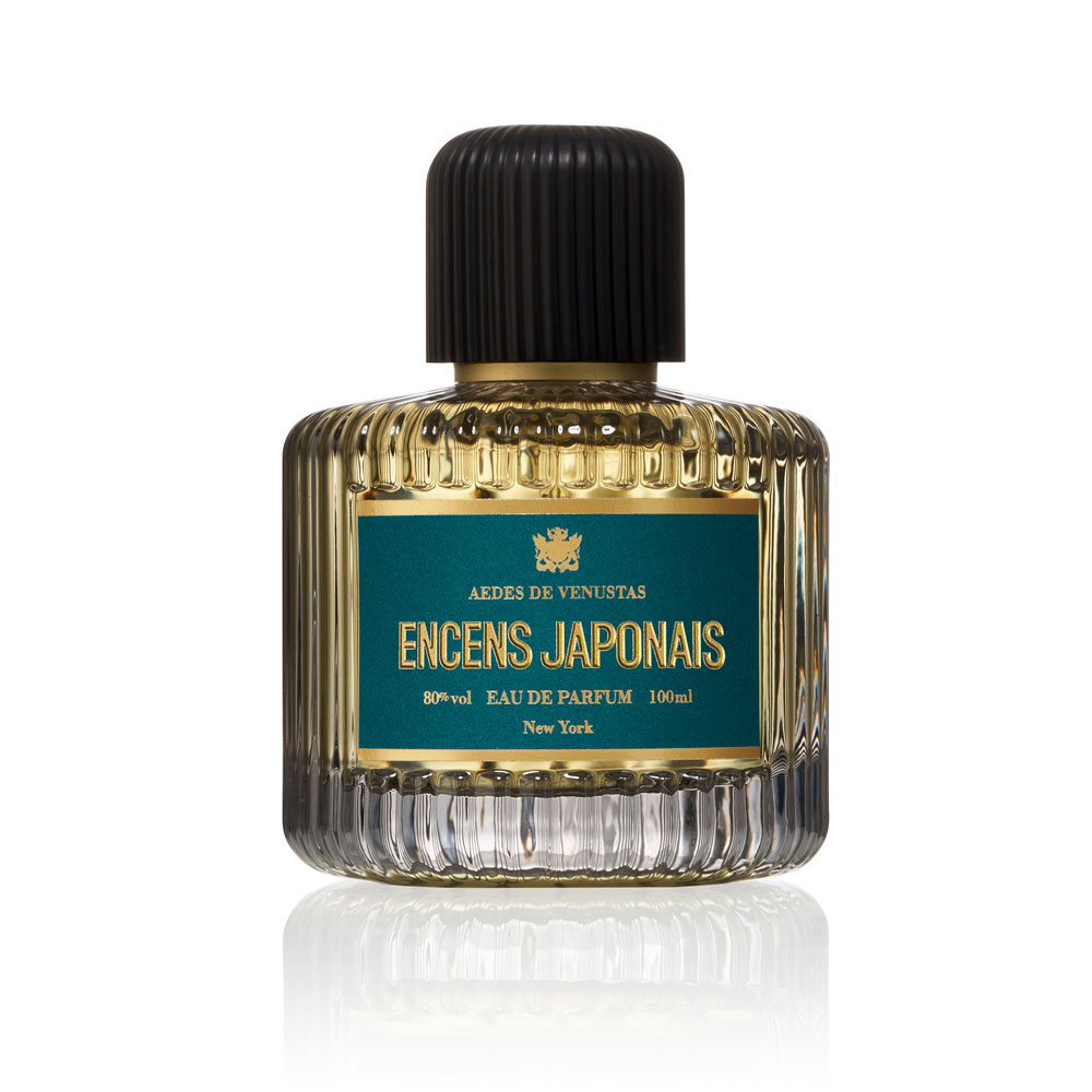 AEDES DE VENUSTAS ENCENS JAPONAIS è presentato in un vaso prezioso: una bottiglia di vetro scanalato caratterizzata da accenti blu pavone, un tappo nero opaco con stemmi stampati e un design elegante ma pesante che segna il capitolo successivo nella storia di AEDES DE VENUSTAS.