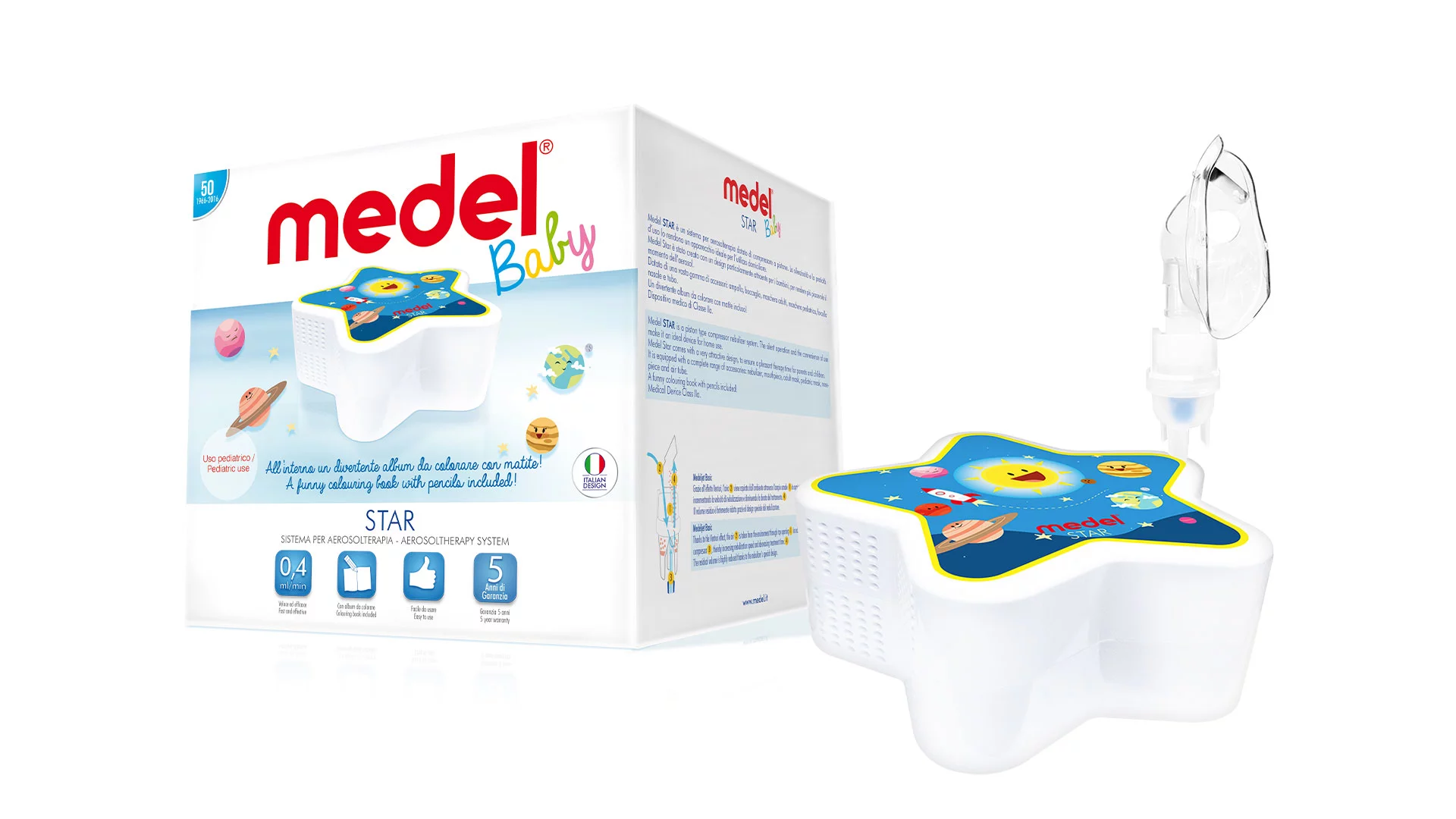 Medel STAR è un sistema per aerosolterapia dotato di compressore a pistone adatto ai bambini.