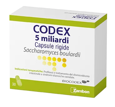 Non mescolare Codex con liquidi troppo caldi o con soluzioni alcooliche. In considerazione della natura fungina di Saccharomyces boulardii, Codex non deve essere somministrato durante la terapia antifungina topica o sistemica. Informazioni generali – Il trattamento della diarrea non è sostitutivo della reidratazione, quando necessaria. L’entità della reidratazione e la sua via di somministrazione devono essere commisurate alla gravità della diarrea e all’età ed allo stato di salute del paziente. – Si sono verificati casi molto rari di fungemia (ed emocolture positive per i ceppi di Saccharomyces) e sepsi per lo più in pazienti con catetere venoso centrale, malati in condizioni critiche o immunocompromessi, risultanti nella maggior parte dei casi in piressia. Nella maggioranza dei casi l’esito è stato soddisfacente dopo l’interruzione del trattamento con Saccharomyces boulardii, la somministrazione di un trattamento antimicotico e la rimozione del catetere, laddove necessario. Tuttavia, l’esito è stato fatale in alcuni pazienti in condizioni critiche (vedere paragrafo 4.3 e 4.8). – Come per tutti i farmaci a base di microorganismi vivi, è necessario prestare particolare attenzione durante la manipolazione del prodotto, principalmente in presenza di pazienti con catetere venoso centrale, ma anche in presenza di pazienti con catetere venoso periferico, anche se non trattati con Saccharomyces boulardii, al fine di evitare la contaminazione da contatto e/o la diffusione dei microorganismi per via aerea (vedere paragrafo 4.2). Informazioni importanti su alcuni eccipienti CODEX 5 miliardi capsule rigide – contiene lattosio. I pazienti affetti da rari problemi ereditari di intolleranza al galattosio, da deficit totale di lattasi, o da malassorbimento di glucosio-galattosio, non devono assumere questo medicinale – non contiene glutine.