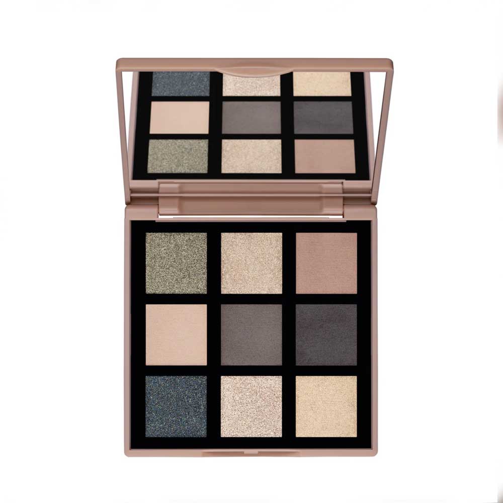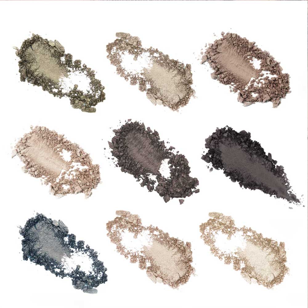 Quattro ombretti matt declinati in diverse tonalità: una nuance color crema, ideale per creare la base del make up; due ombretti scuri: nero e grigio scuro per intensificare lo sguardo e definire la forma dell’occhio; una nuance media color tortora, che funge da transizione tra i chiari e gli scuri. Cinque ombretti extra-pearl che giocano sui toni del platino, dell’argento e del blu scuro, ideali per illuminare la base e impreziosire ogni look. Gli ombretti opachi si presentano in una formula altamente pigmentata e la texture, liscia e setosa, regala uno straordinario comfort. Gli ombretti extra-pearl sono realizzati in una texture sensorialmente cremosa ed impreziosiscono qualsiasi tipologia di make-up occhi.