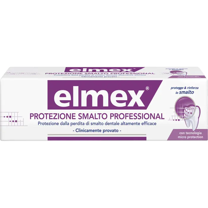 Il dentifricio elmex Protezione Smalto Professional con la sua esclusiva tecnologia “Microprotection” promuove la formazione di uno strato di stagno protettivo sulle superfici dentali. Lo smalto diventa più resistente agli attacchi acidi perché si forma uno strato protettivo per rinforzare lo smalto contro frequenti attacchi acidi. Inoltre, il fluoruro amminico rinforza e protegge i denti dalla carie.