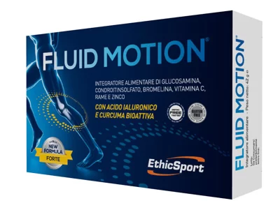 Integratore alimentare di glucosamina, condroitinsolfato, bromelina, vitamina C, rame e zinco, con acido ialuronico ed estratto bioattivo di curcuma Curcugreen. L’estratto di curcuma Curcugreen, standardizzato al 95% in curcuminoidi totali è caratterizzato da elevata biodisponibilità, svolge un’azione antiossidante e contribuisce alla funzionalità articolare. La vitamina C contribuisce alla normale formazione del collagene per la regolare funzione delle cartilagini e delle ossa. La bromelina è un enzima proteolitico associata nel prodotto a glucosamina, acido ialuronico e condroitinsolfato, per offrire una formulazione particolarmente completa. Fluid Motion apporta anche rame e zinco, costituenti di coenzimi che svolgono un ruolo attivo nel fisiologico metabolismo delle cartilagini. Il rame in particolare contribuisce al mantenimento di tessuti connettivi normali.