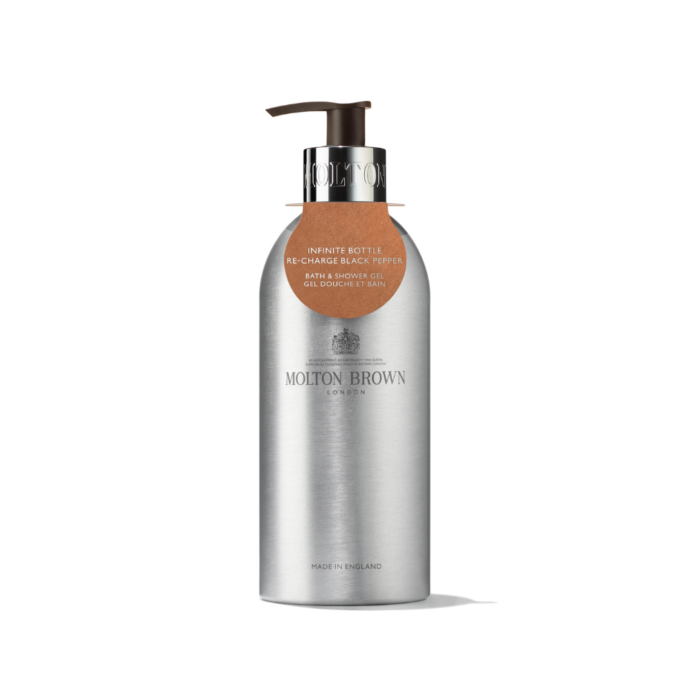 Iconico gel doccia legnoso agrumato in un flacone più sostenibile e duraturo, realizzato con alluminio riciclato al 100%. Fai il pieno di energia grazie a questa carismatica fragranza composta da avvolgente pepe nero, coriandolo speziato e vetiver terroso. Utilizza la ricarica per riempire di nuovo il flacone una volta terminato ed aiuta Molton Brown a salvaguardare il pianeta e a ridurre gli spechi.