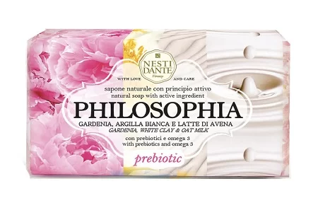 Il sapone vegan Philosophia Prebiotic combina prebiotici e Omega 3 con il profumo floreale di gardenia, argilla bianca e latte d’avena.