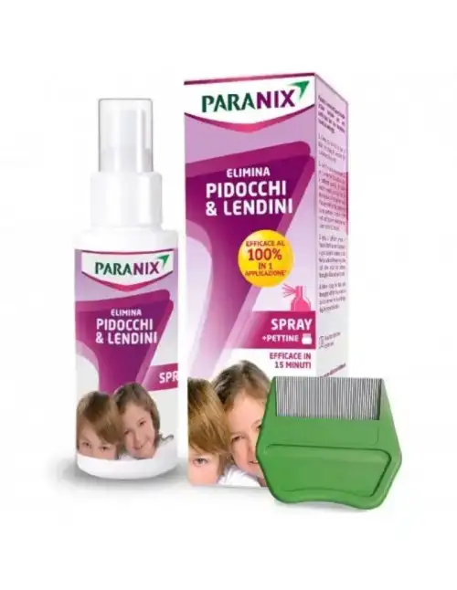Il trattamento spray Paranix contiene dimeticone e oli minerali per soffocare e disidratare i pidocchi e le lendini presenti su capelli e cuoio capelluto. La sua formula non contiene pesticidi e sviluppa un’azione di tipo meccanico per la quale i pidocchi non possono sviluppare resistenza. Paranix è uno spray mousse che agisce in 10 minuti, è inodore e non cola. È consigliato per eliminare pidocchi e lendini da ogni tipo di capello, sia lungo che corto, ed è clinicamente testato per assicurare la più alta tollerabilità. La confezione è dotata di uno speciale pettine metallico con denti stretti che facilita la rimozione delle lendini morte dopo l’applicazione dello spray.