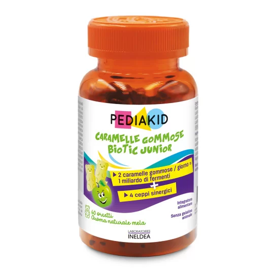 Le Caramelle gommose Biotic Junior PEDIAKID® associano 4 ceppi di Probiotici con effetto sinergico (Lactobacillus acidophilus, Lactobacillus casei, Lactobacillus plantarum, Streptococcus thermophilus) rigorosamente selezionati per le loro proprietà e oggetto di un trattamento specifico per garantire una perfetta stabilità. Due caramelle Gommose al giorno apportano 1 miliardo di Probiotici. Pensate per i bambini, le Caramelle gommose Biotic Junior PEDIAKID® offrono una formula pratica, divertente e naturale. Queste caramelle gommose a forma di orsetti sono senza gelatina, senza conservanti, senza glutine, senza lattosio, senza aromi né coloranti artificiali.