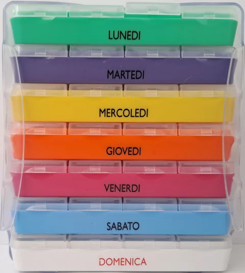 PILLOLBOX 7GG MULTICOLOR PORTAPILLOLE 7 GIORNALIERI 4 SCOMPARTI è’ un PARAFARMACO USO UMANO.