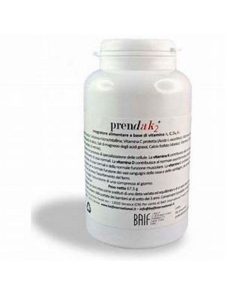 A base di vitamine A, C, D3 e K2, utili per la salute delle ossa e dell’apparato cardiovascolare. La formulazione innovativa di prendak2 nasce da recenti scoperte sulle innumerevoli proprietà della vitamina K2 in sinergia con la vitamina D3 e la vitamina A. La vitamina K2, anche conosciuta come menachinone, è una vitamina liposolubile appartenente alla famiglia delle vitamine K. Svolge numerosi ruoli fondamentali per la salute, ed in particolare è coinvolta nell’attivazione di proteine che hanno il compito di legare il calcio alle ossa e ai denti e di inibire la calcificazione dei tessuti molli, in particolare delle arterie, apportando notevoli benefici alla salute delle ossa e all’apparato cardiovascolare. La caratteristica principale di prendak2 è la sinergia d’azione dei componenti che associa la vitamina K2 con le vitamine D3 ed A.