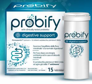 Probify digestive support è un integratore di fermenti lattici utili per favorire la corretta presenza della flora batterica nell’intestino e per supportare la funzione digestiva della stomaco.