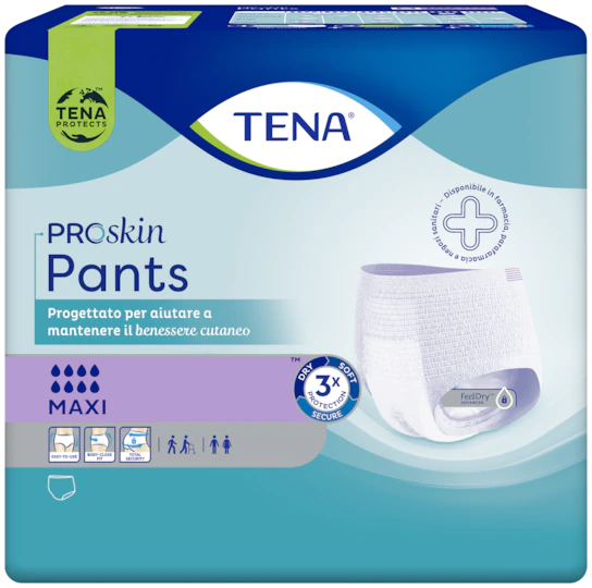 Gli ausili TENA Proskin offrono Tripla Protezione per una sensazione di asciutto e di morbidezza a contatto con la cute e per un’elevata protezione contro le perdite, per contribuire a mantenere il benessere cutaneo.