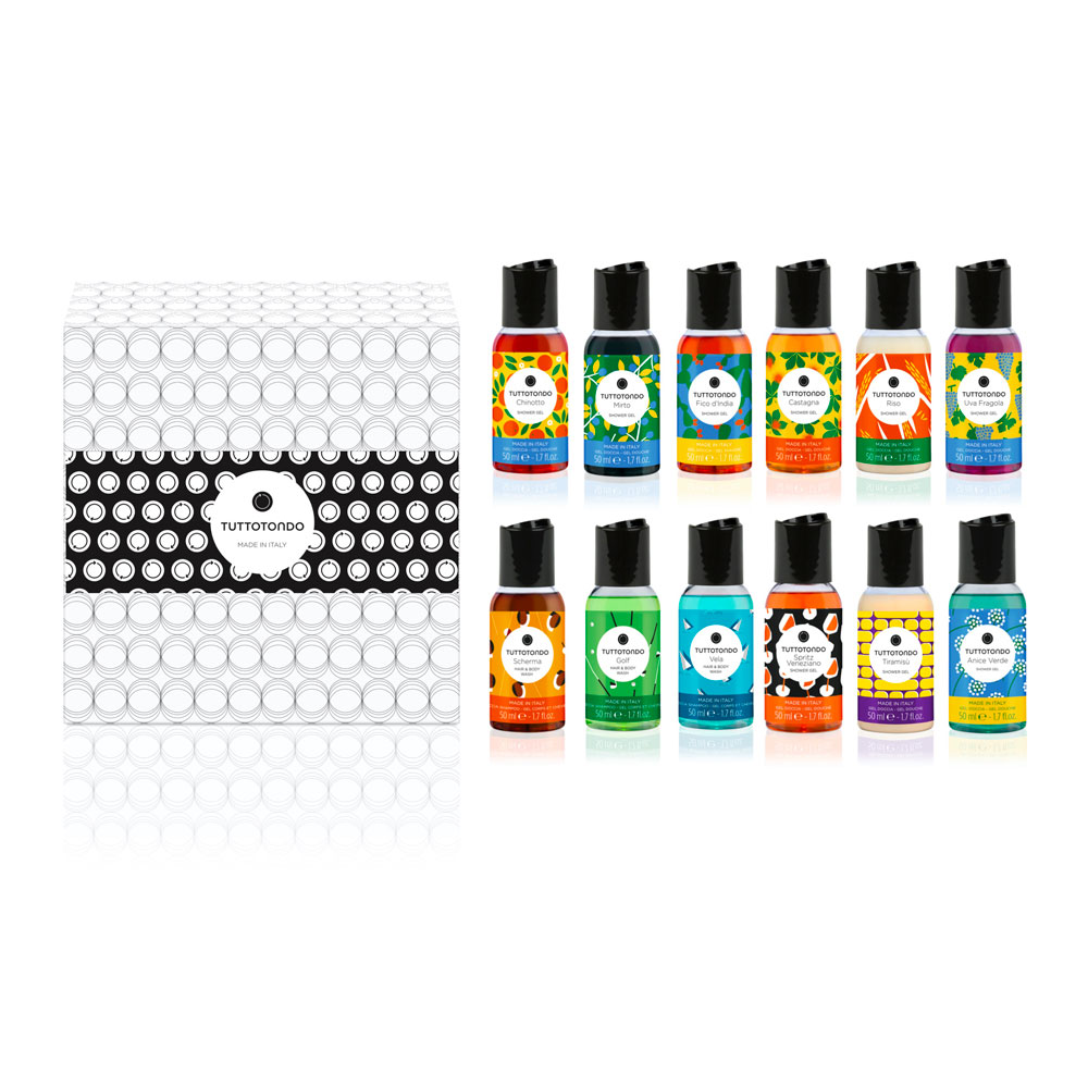 12 shower gel 50ml assortiti: Chinotto, Mirto, Fico d’India, Castagna, Riso, Uva fragola, Scherma, Golf, Vela, Spritz veneziano, Tiramisù, Anice verde
